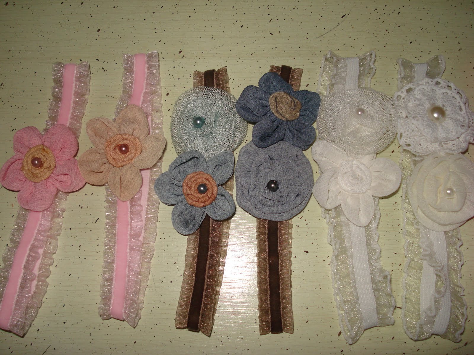 So today when I was aimlessly walking around Hobby Lobby after finding the picture frame I came to get (why does this always happen), I somehow ended up in one of the scrapbooking aisles (I currently do not even scrapbook) and came across these cute little flowery things that looked very similar to the rosettes that are on some headbands I recently ordered from etsy (see above). I got this crazy idea that I could find some elastic and somehow attach them. Well, low and behold I did find some elastic and voila! I would like to find some other elastic colors, but I am pretty pleased with these for now.